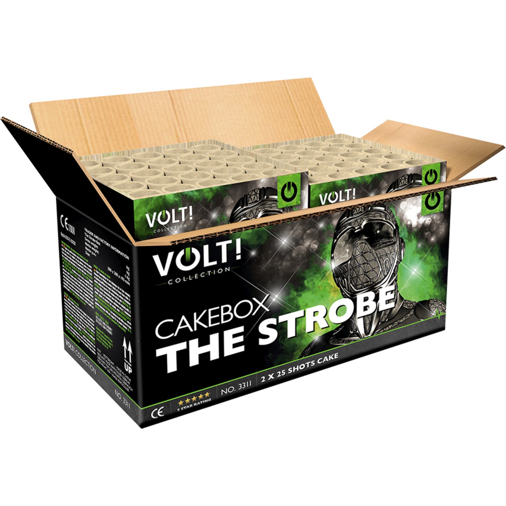 Een 50-schots connected cakebox met maximaal kaliber: de show begint met sprankelende blinkers in verschillende kleuren en neonfelle sterren, gevolgd door schitterende salvo’s van gouden glitter en kleurrijke parels.